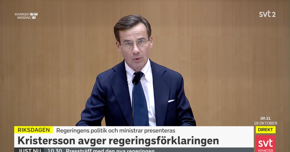 2 min 34 sek. Sverigedemokraterna står utanför men ska samarbeta med övriga tre får ett. I dag presenterade tillträdande statsminister Ulf Kristersson regeringsförklaringen i riksdagen och anmälde i samband med.